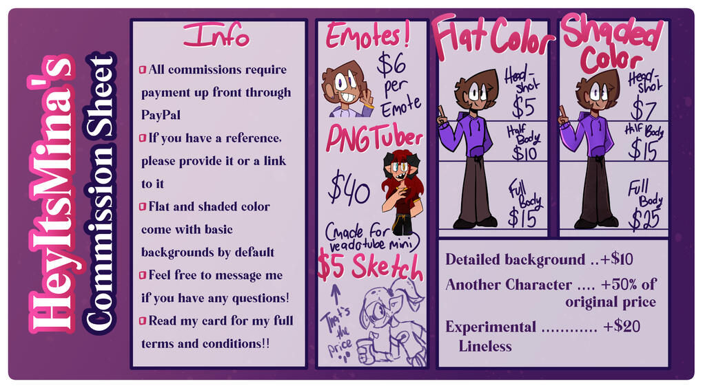 (I am ok with drawing light blood)• I reserve the right to turn down a commission, for personal circumstances (i.e. I am not comfortable doing said commission, or I know beforehand I'm unable to complete it)By commissioning me, you acknowledge and agree to all the below -______________________• I own the artwork and can post it to my social media accounts (YouTube, Twitter, etc.).• You may not remove my signature from a commission.• You may not resell my artwork, claim my art as yours, or trace/heavily use my art as reference and claim it as your own.• You will not receive the original files for a commission, unless agreed upon in private conversation for a specific use case.• After I receive payment, you may not cancel a commission, nor will there be any sort of refund if you are unsatisfied.• I will not start a commission unless I receive full payment.• I will not redo a commission after already finishing, however I am open to make slight changes to a commission at that point.• If you are using my art for a commercial purpose, it must be brought up to me, and be discussed and agreed upon in private conversation before payment.